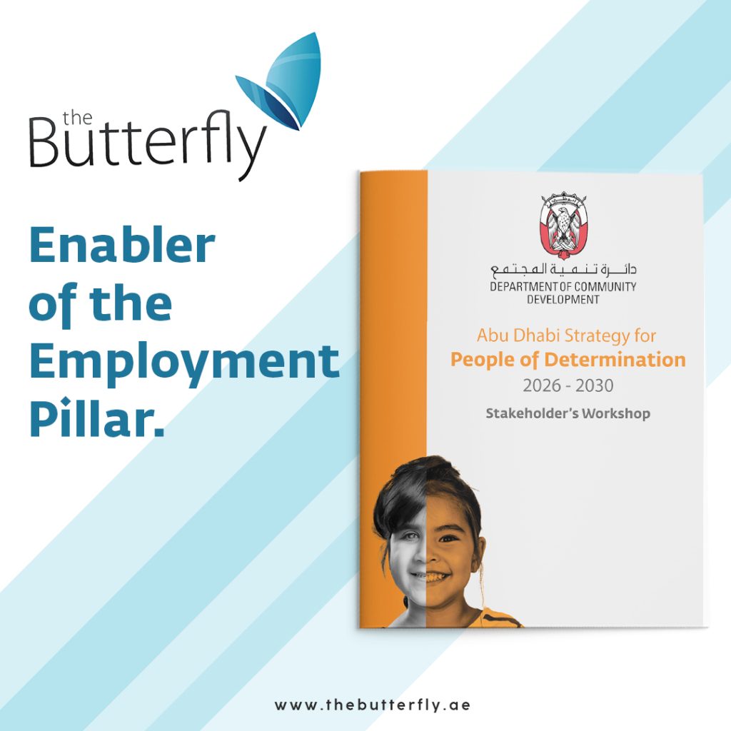 Image description: A promotional graphic from The Butterfly with the text “Enabler of the Employment Pillar.” On the right is a booklet cover for the “Abu Dhabi Strategy for People of Determination 2026–2030 Stakeholder’s Workshop” by the Department of Community Development, featuring a half orange, half black-and-white photo of a smiling child. The Butterfly logo with a blue butterfly icon appears at the top left, and the website “www.thebutterfly.ae” is at the bottom.
